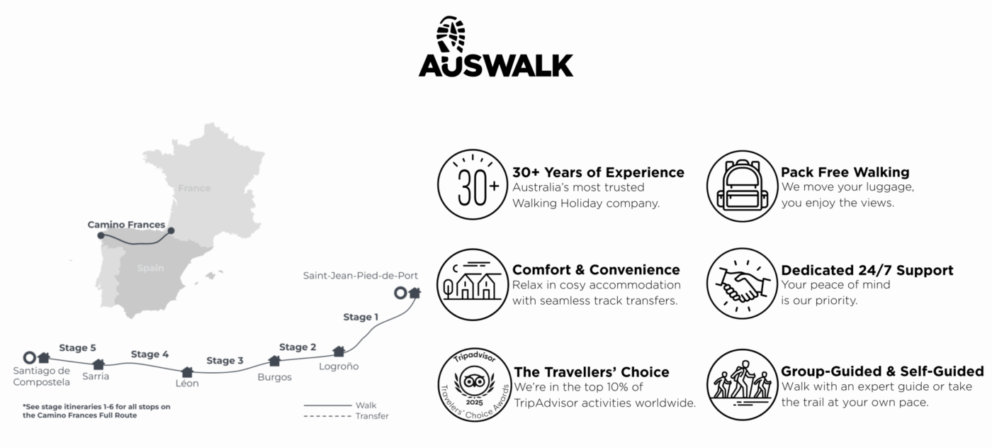 The Camino Francés, or the French Way, is the most popular and well-trodden route of all the Caminos. The pilgrimage trail starts at the trailhead in France at Saint-Jean-Pied-de-Port, and travels through France for just 26km. The whole walk is 780 kilometres (485 miles)and travels across northern Spain to Santiago de Compostela. Walkers or pilgrims pass through diverse landscapes, historic Spanish towns, and vibrant cities like Leon, experiencing the spiritual and cultural richness of the Camino. The camaraderie amongst the walkers is second to none. For walkers that are interested in a supported self-guided adventure, there are several options available, each catering to different preferences and fitness.
