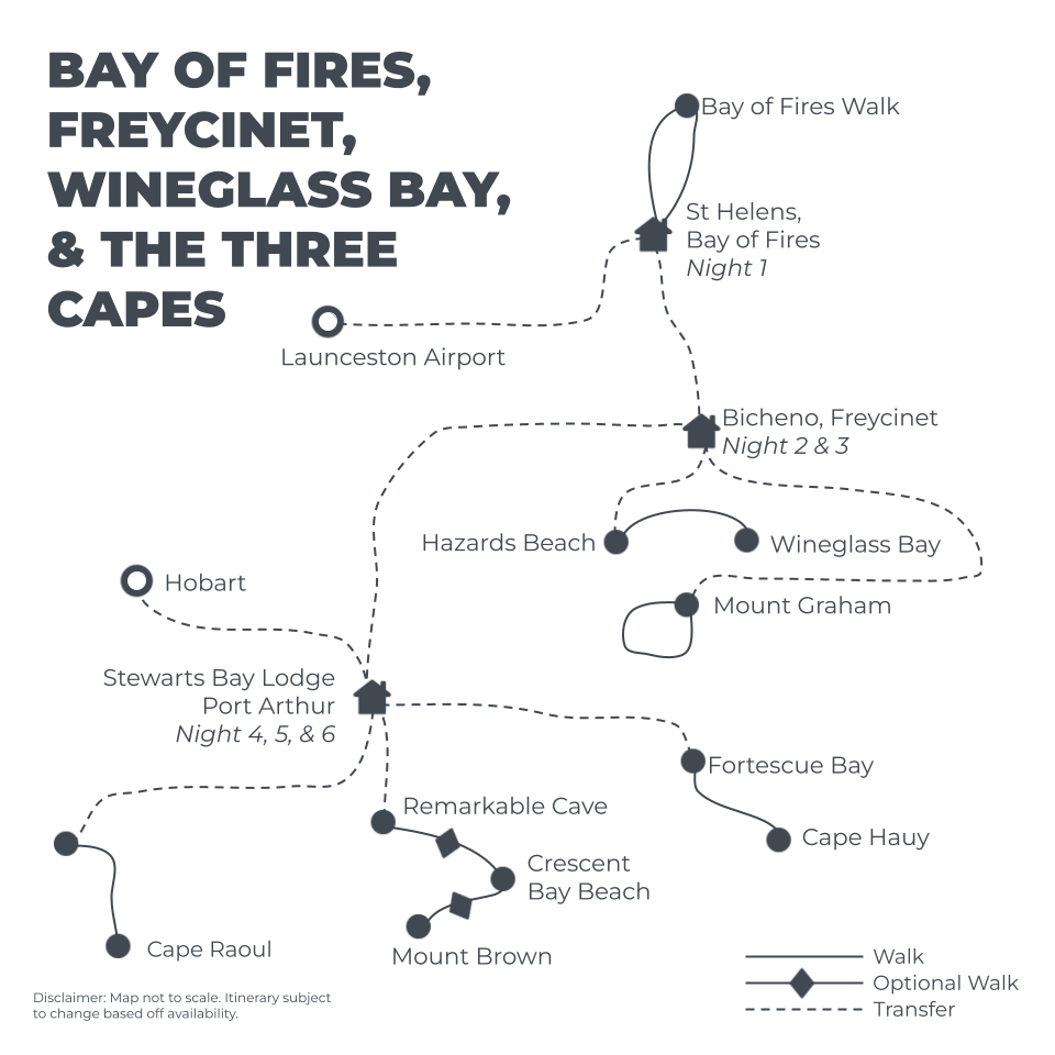Good balance between Bay of Fires and Freycinet. Georgie and Marcus were organised, interesting and physically good guides. An extra day in Freycinet to climb Mount Freycinet would be a good addition. The scenery was beautiful along the coastline.