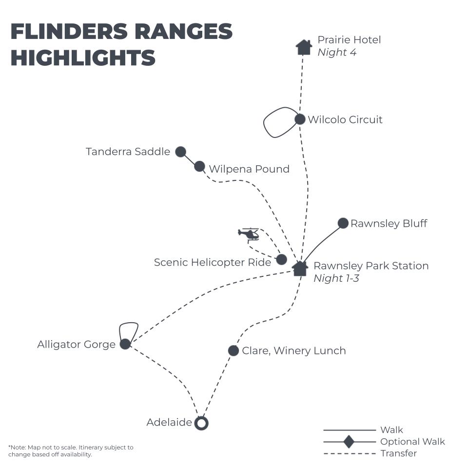 Today we head to the iconic Prairie Hotel, a character-filled outback pub set against the dramatic backdrop of the Elder Range. On the way we’ll explore the Wilcolo Circuit, a rewarding walk that winds through rugged ranges, native cypress pines, and red-rock country typical of Ikara–Flinders Ranges. Along the way, keep an eye out for yellow-footed rock wallabies and soaring wedge-tailed eagles. The walk culminates with a visit to Bunyeroo Lookout, where sweeping views across the vast, ancient landscapes of Bunyeroo Valley reveal the remarkable geological folds that make this region so distinctive. There is also the optional extra of visiting other walks en route if time permits.