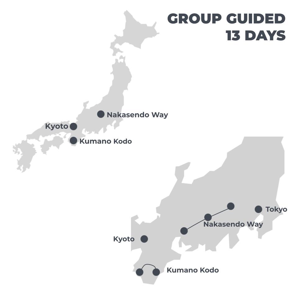 On this walk, you will have to catch trains in between the destinations at your own expense, which is pretty straightforward. The two main journeys are between Kyoto and Tanabe and then from the Kii-Katsuura to Nakatsugawa. There are also two short bus rides on the Kumano Kodo. Our guide will be with every step of the way to assist in this process.