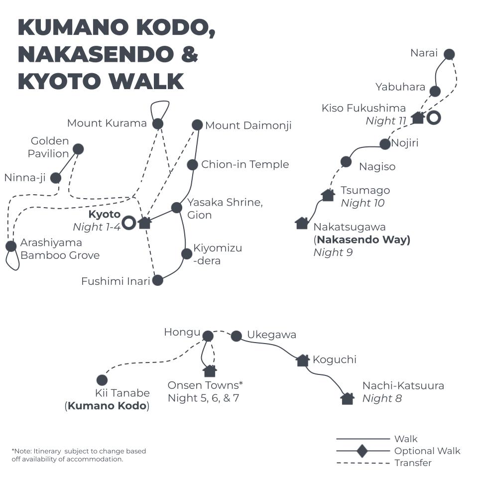 Luggage transfers are only needed on the Kumano Kodo Nacahechi and Nakasendo routes. You will need to bring your luggage with you as you travel from Kyoto to the Kumano Kodo and to the Nakasendo Way. It is an unnecessary cost to incur having your luggage travelling separately from you.