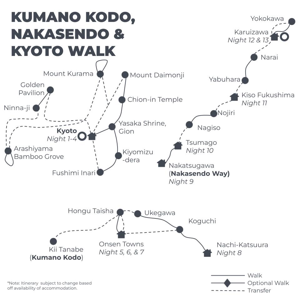 From Kyoto you will be travelling to Kii-Tanabe to commence the Kumano Kodo Highlights walk. Travel time is approx. 4.5 hrs. The Kumano Kodo walk ends in Kii-Katsuura and you will need to travel to Nakatsugawa to commence the Nakasendo Highlights walk. This will require a morning train ride and will take approx. 4.5 to 5hrs. The Nakasendo walk ends in Karuizawa, a 1hr train ride to Tokyo.