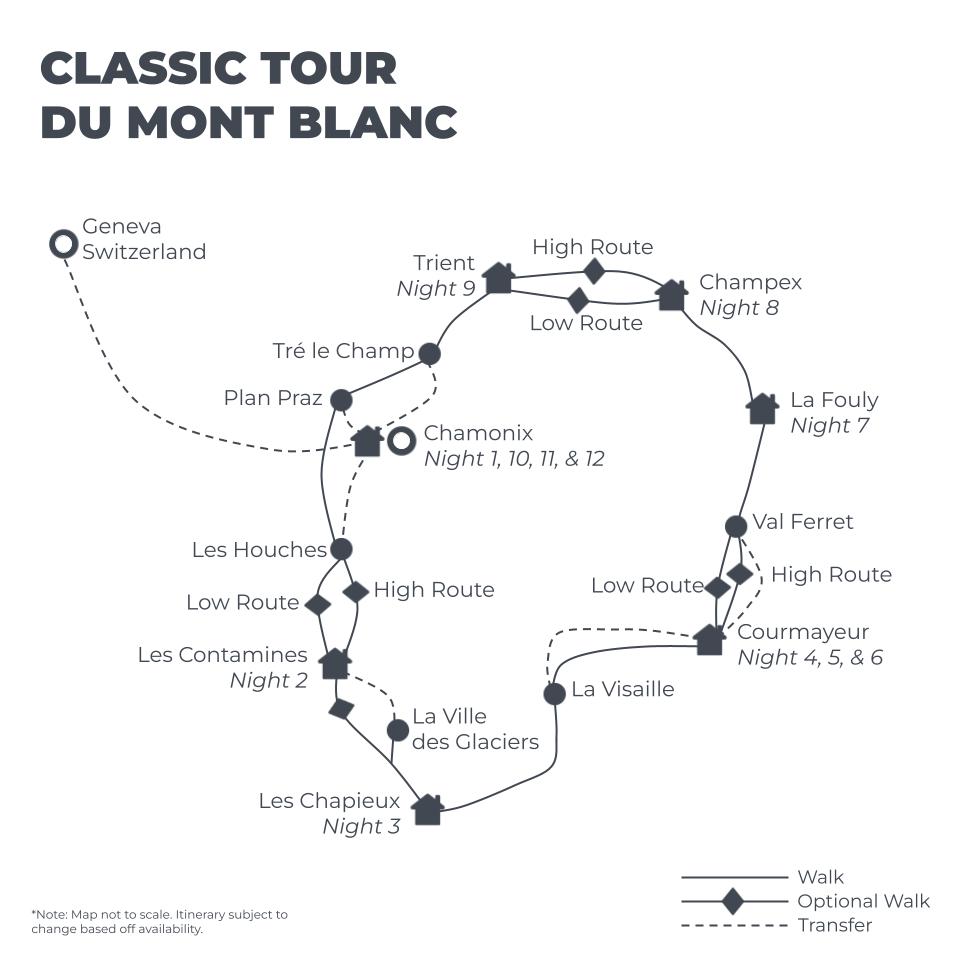 The alternative is the High Route which heads over the challenging Fenetre d’Arpette (2665m). Considered by many as the toughest day on the circuit, the ascent and descent follows a steep, exposed rocky trail across boulder fields and scree slopes. Incredible views of the Trient Glacier and a day of real mountain adventure!