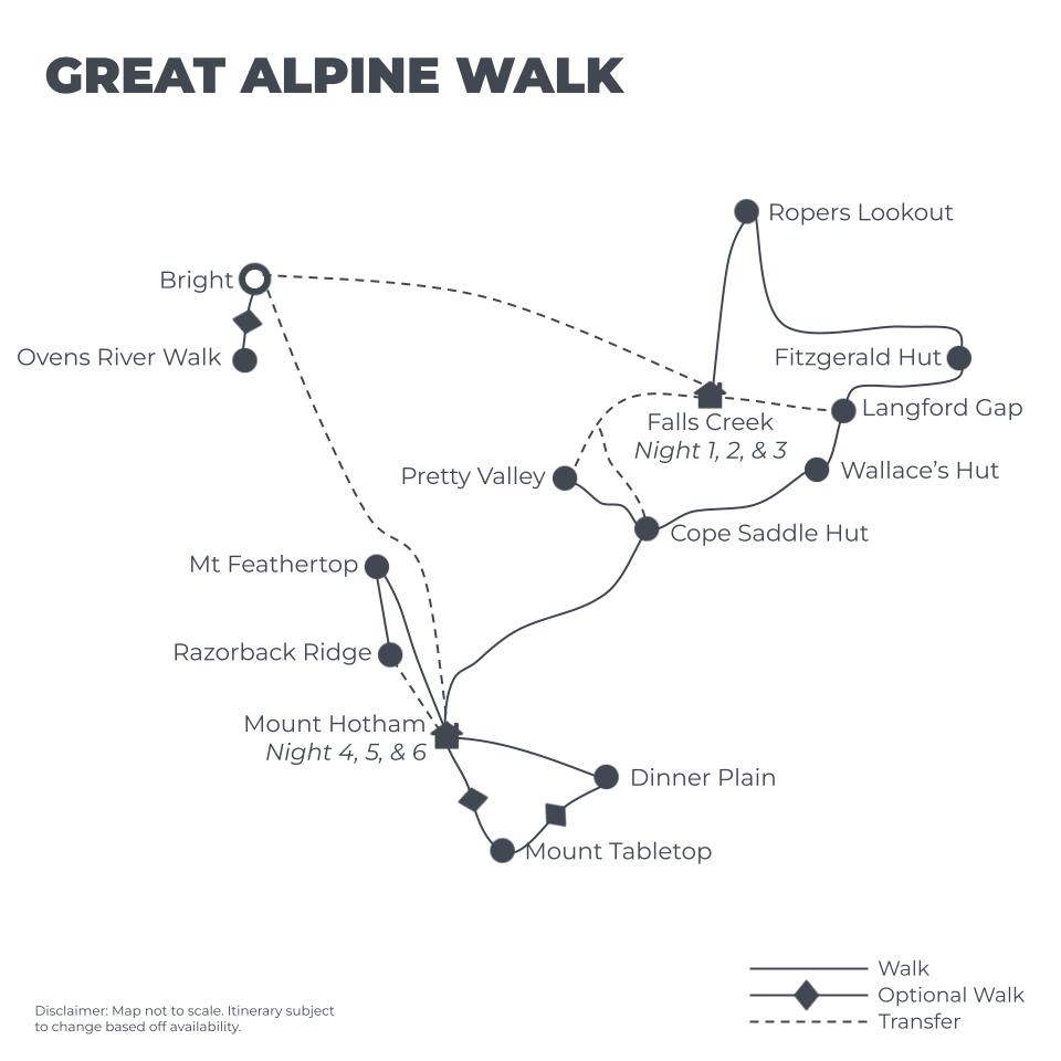This Great Alpine Walk starts and finishes in Bright. It’s a 5-hour drive from Melbourne, with public transport services available from the city. Contact us for more details.