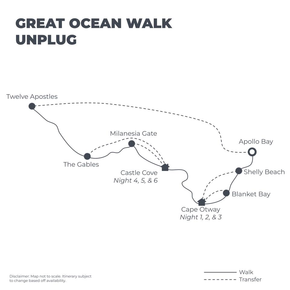 The walk starts in Apollo Bay on the Great Ocean Road and ends in Port Campbell. As you are walking on day 1 we recommend starting your walk at 12pm to comfortably be at the pick up point on time. Fast walkers can explore Apollo or start slightly later if necessary.