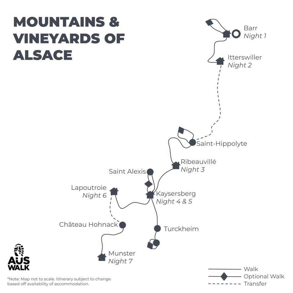 Day 5: Once you arrive in Turckheim the optional loop walk takes you through vineyards and wooded trails up to the Château de Hohlandsbourg with views over the Rhine Plain and the Vosges Mountains.