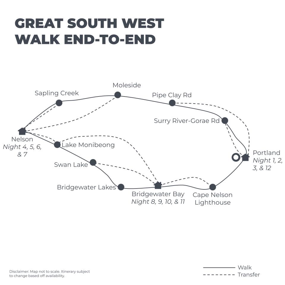 I was a member of a group that did sections of the Great South West Walk on a self-guided basis, customised by Auswalk to the group’s requirements. All the details and logistics were handled by Auswalk, and everything worked like clockwork. The notes were good and the maps provided by Auswalk were outstanding.Both of the places we stayed at were obviously familiar with dealing with Auswalk and all the arrangements, including the drop-offs and pick-ups went without a hitch. On the two longest days, the arrangements provided options for drop-offs allowing some shortening of the days concerned, which the B&B hosts (who provided the transport) were happy to work with.The arrangements included some self-catering and the B&B proprietors were very helpful in assisting with this aspects.